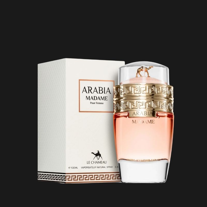 Arabia Madame abre com uma explosão vibrante de cítricos — limão, laranja, e bergamota — que se unem a nuances de mandarina para um início fresco e luminoso. Imediatamente, revela um coração floral encantador com jasmim, rosa e patchouli, formando um buquê delicado e sofisticado que lembra os jardins exuberantes do Oriente. As notas de base mergulham no calor aconchegante da baunilha e vetiver, ao lado de almíscar, sândalo e âmbar, oferecendo finalização cremosa, envolvente e uma assinatura olfativa longa e marcante.