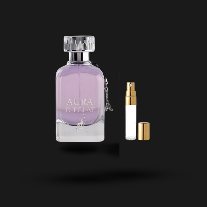 Tamanho do Frasco: Disponível em um Decant de 5 ml,10ml e 30ml, Aura D'Eclat oferece uma excelente durabilidade e uma projeção moderada, ideal para o uso diário e para eventos especiais.