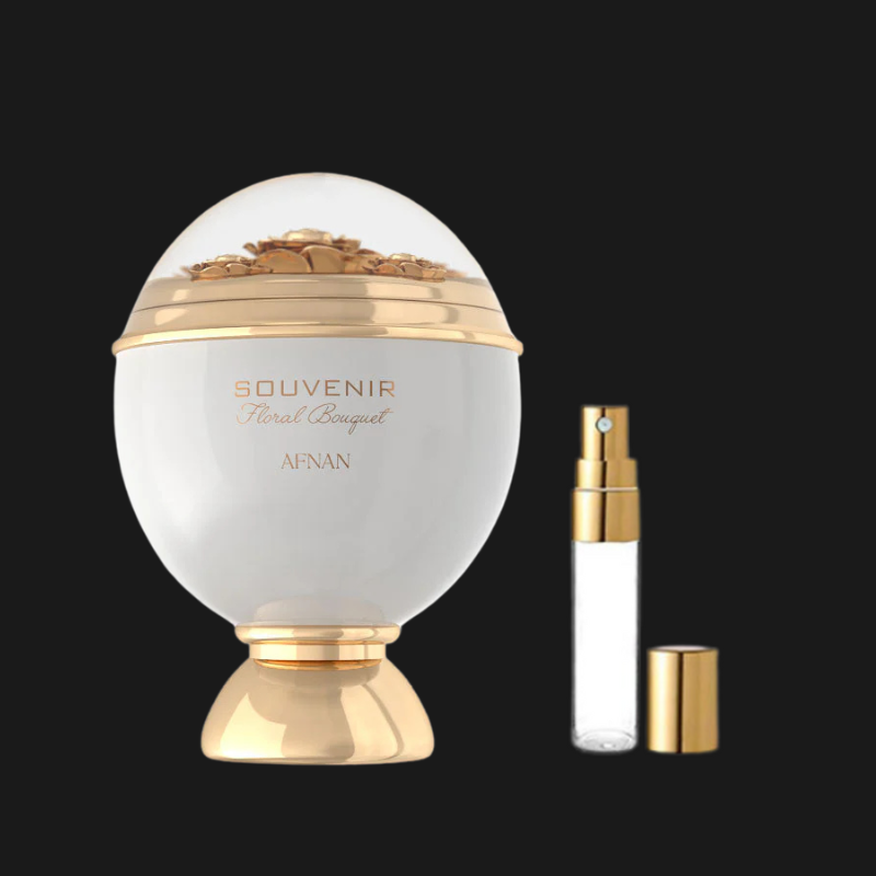 A abertura do Souvenir Floral Bouquet é marcada por uma explosão refrescante de ruibarbo e lichia, complementada pela bergamota. No coração, notas florais como rosa e peônia se destacam, criando uma sensação suave e delicada. A base é composta por musk, madeira de cashmere e âmbar, que proporcionam profundidade e calor à composição.